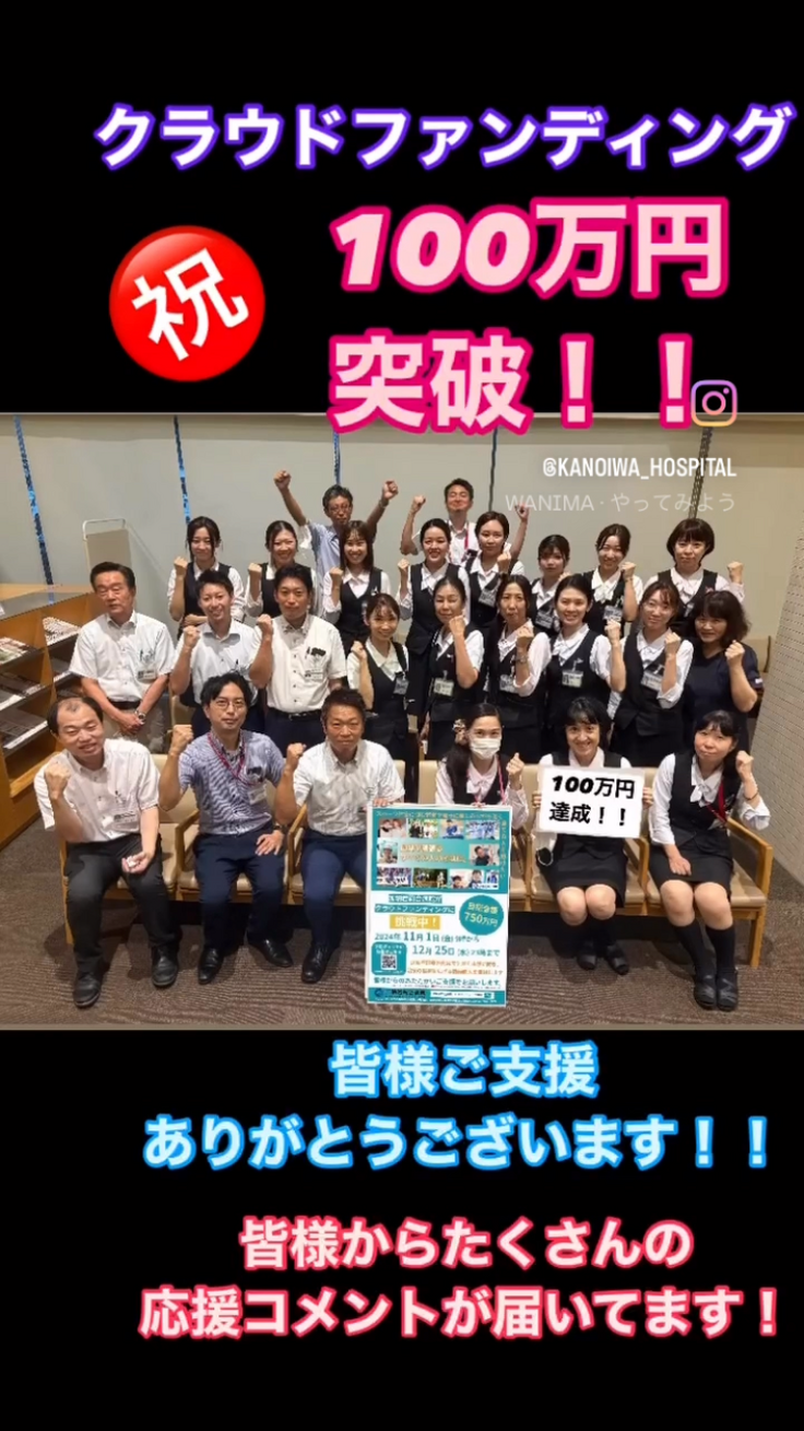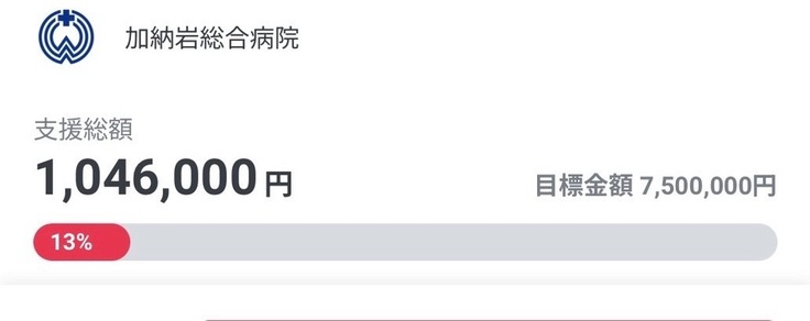 遠方からエール、近隣の皆様、職員ご関係者、ご友人の皆様、また同じ医療従事者の方々など、多くの皆様からのご支援により100万円の壁を越えることができました!!🎉