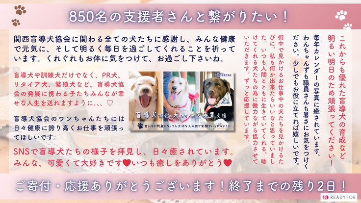 このたびは、関西盲導犬協会のプロジェクトにあたたかいご寄付、応援をいただき、誠にありがとうございます。