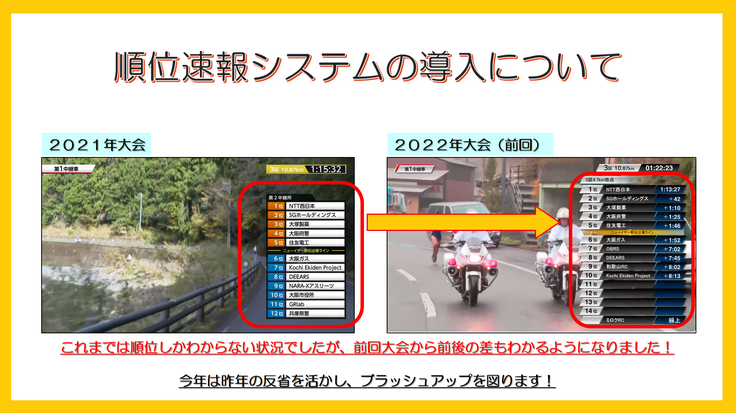 カメラだけでは各チームの差がわからず、優勝争いやニューイヤー駅伝の出場枠争いの状況がどうなっているか、これまでは中継所通過時にしかわかりませんでした。昨年は雨の影響やチェックポイントの数が多すぎたことにより、うまく機能しないポイントも一部ございました。今回はその反省を生かし、よりブラッシュアップした形で運用をして参ります。
