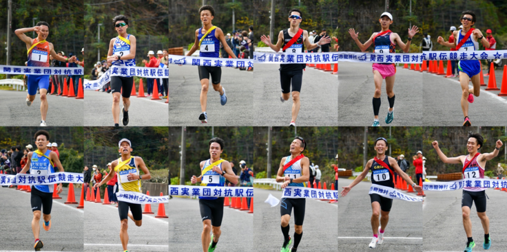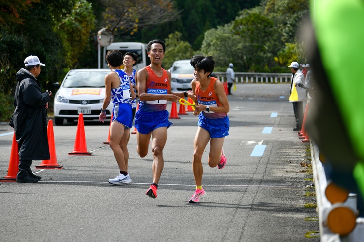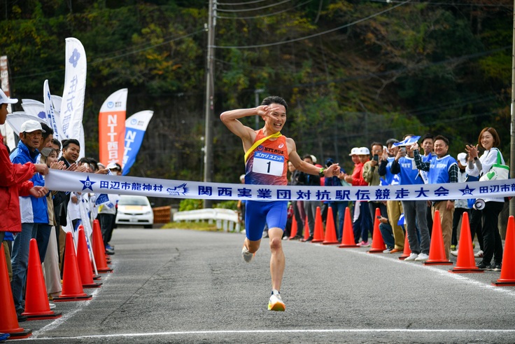 それを追うNTT西日本は2区、3区と区間2位で粘り、4区服部選手が区間賞(SGH鈴木選手と同タイム)を獲得。エース区間の5区で一色選手が区間2位の選手に1分以上差をつける区間賞の快走で、一気にトップを奪取しました。続く6区、7区も区間2位の走りを見せ、アンカー北﨑選手が二連覇のゴールテープを切りました!