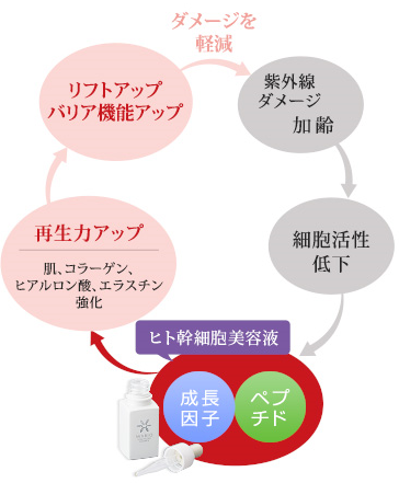 ヒトの幹細胞を培養して得られる培養液には、ヒトの成長因子や生理活性物質が豊富に含まれており、細胞活性のスイッチを入れる役割をしてくれます。また、ヒト由来なので人への適合性はすばらしく、高い効果性と低刺激の両立を可能にします。