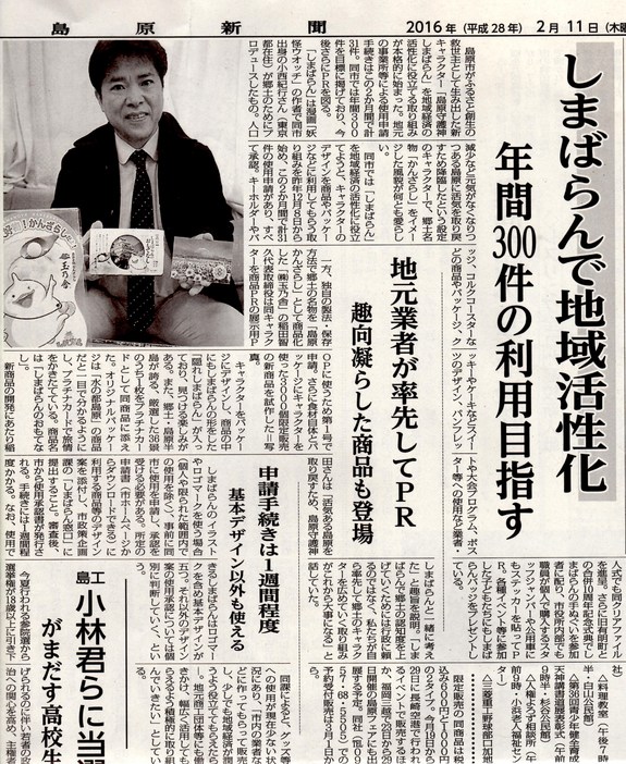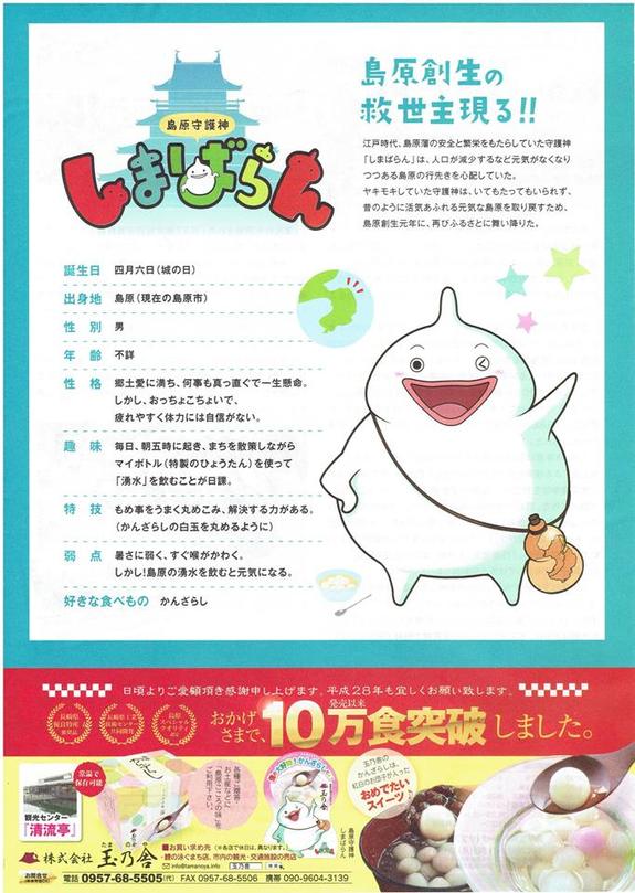 地元島原市が平成27年11月に地方創生の起爆剤として、キャラクター「しまばらん」を小西紀行先生(妖怪ウォッチの作者で島原市出身)に考えて頂きました。このキャラクターを広め地元島原市に経済効果をもたらすべく、キャラクターとコラボの人気スイーツ「かんざらし」を全国に広めたいと考えております。