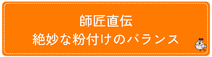 粉の湿り具合、色などで判断する必要があります。納得のいく味付けにするために修行当初は、自分で作った唐揚げと師匠が作った唐揚げを何個も食べ比べその塩梅を体に染み込ませました。
