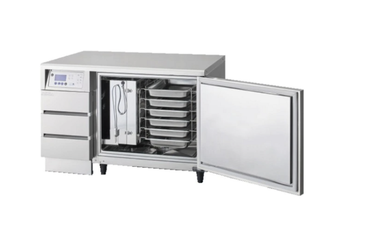 今回、瞬間冷凍機ブラストチラー(上部写真)という、揚げ物と相性の良い空冷式の機械を利用して、店舗で揚げた唐揚げを冷凍にしてお届けする予定です。