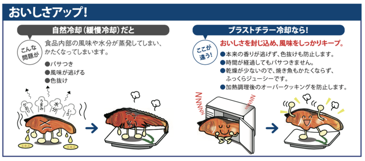 この冷凍機は、空冷のため、衣が蒸されることなく、揚げたての衣のカリッと感を維持することができます。