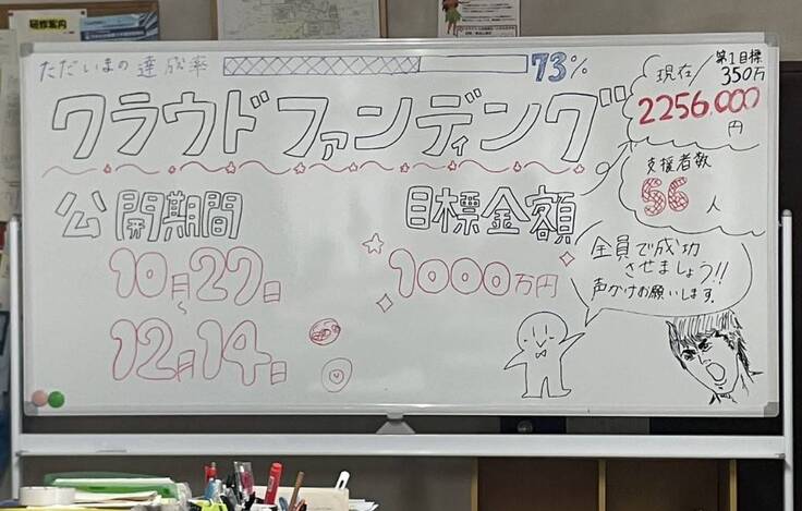 職員室に設置したホワイトボードにクラファンプロジェクトの進捗状況を表示しています
