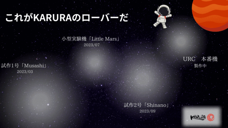KARURAは 月・火星での宇宙開発を支える探査機(ローバー)作りを目標にする瀬戸と 自由な宇宙開発を実現したい垣内 によって作られました。