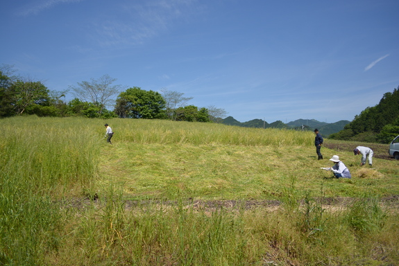 昨年は6月に入ってからの刈取りだったのですが、今年は播種時期が早かったのと、最近の好天により、早く色づきはじめたため、刈取りを始めました。