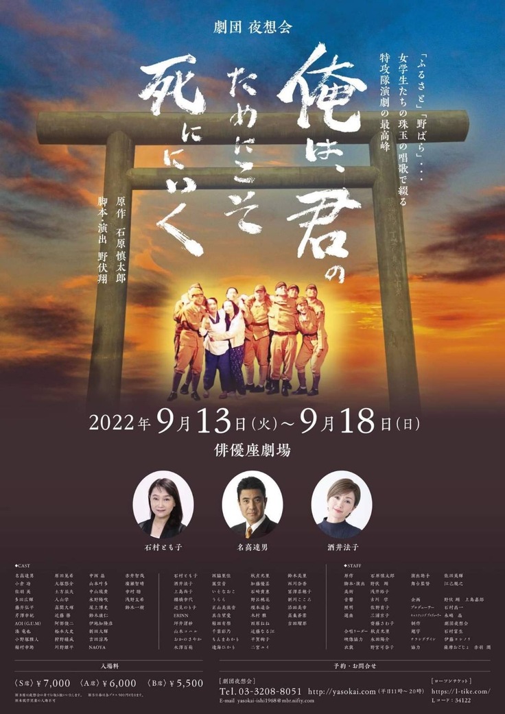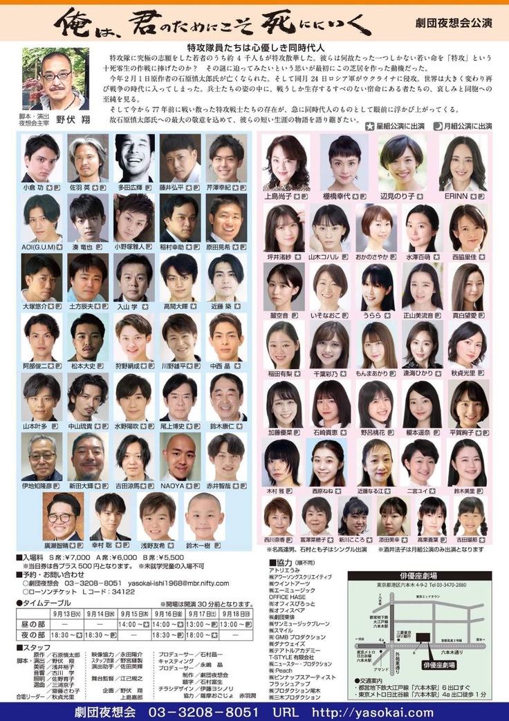 棚橋さんも出演される劇団夜想会の舞台『俺は、君のためにこそ死ににいく』は東京・六本木の俳優座劇場にて9/13(火)~9/18(日)公演です。