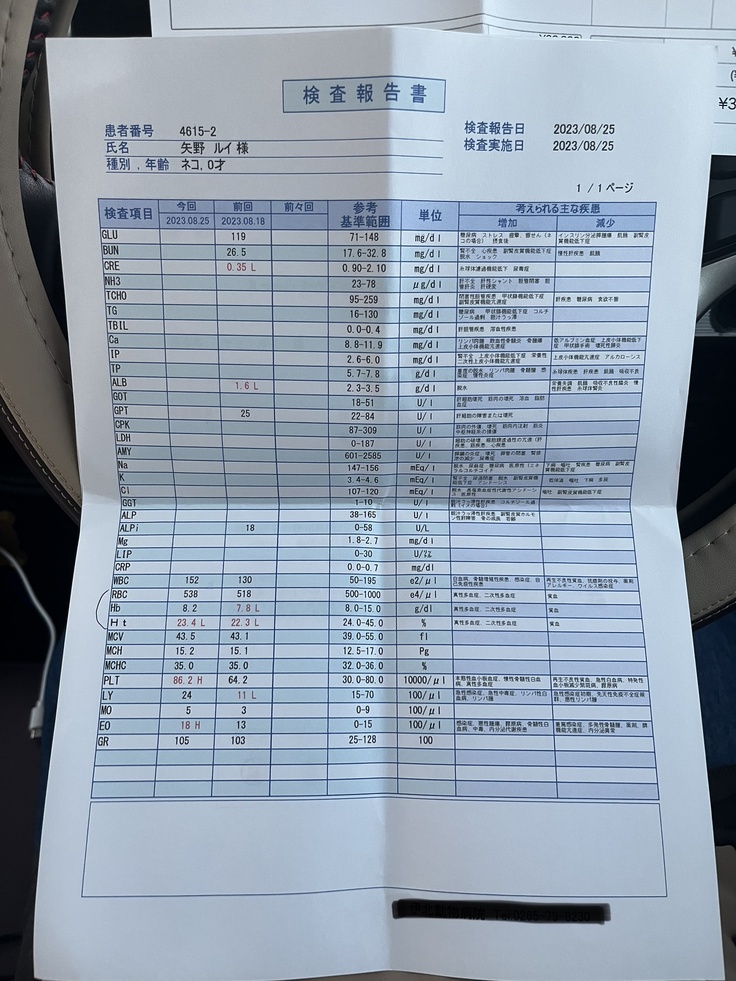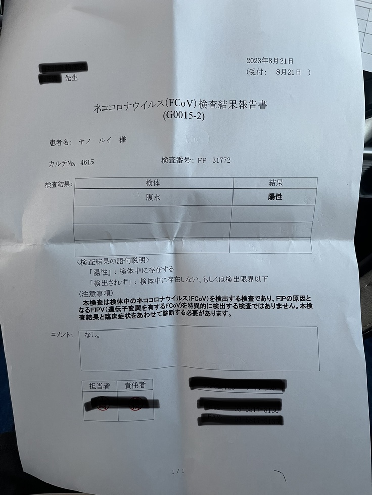 ☆2023.8.22 猫伝染性腹膜炎(FIP)陽性確定。