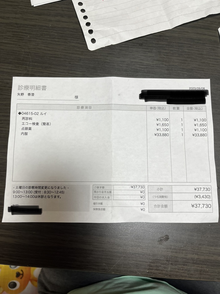 ●金額の支払いについては薬の量や検査によって変わるため、その都度計算され、クレジットカード払いで病院に支払っています。