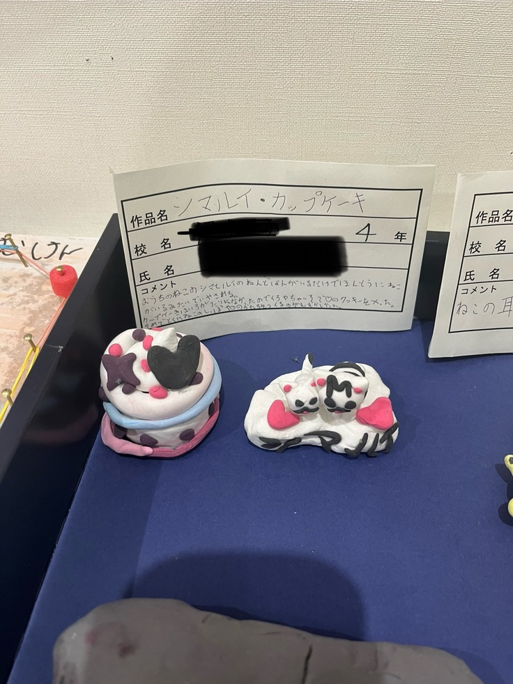 「おうちのねこのシマとルイのねんどばん(粘土版)がいるだけでほんとうに、ねこがいるみたいでいやされる。カップケーキはいろがたりなかったのでくろやちゃいろで♡のクッキーをつくった。とくにねこのしっぽや♡のかたちをつくるのがむずかしかった。」