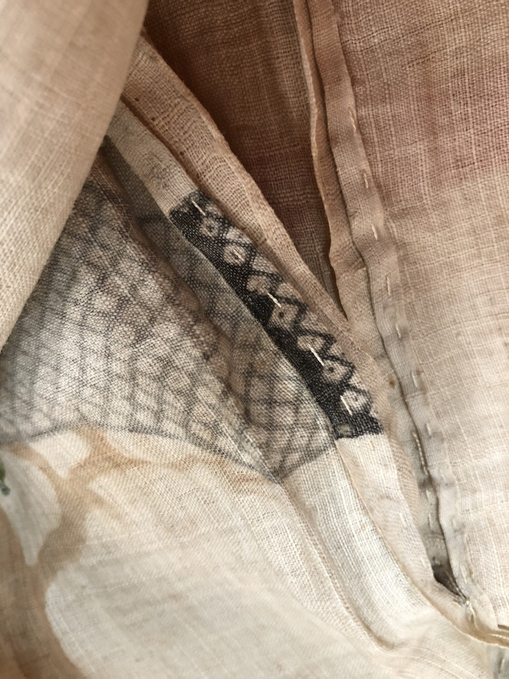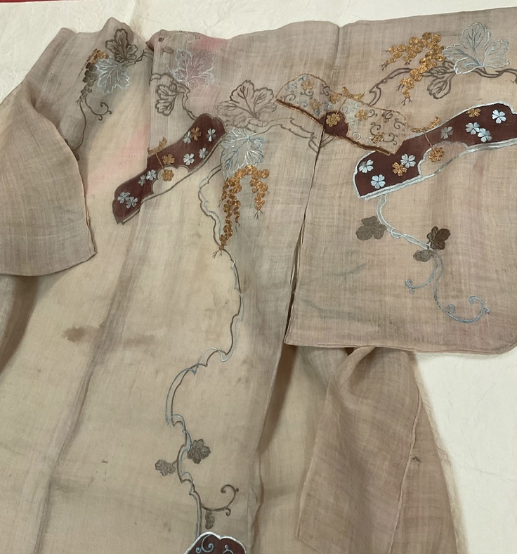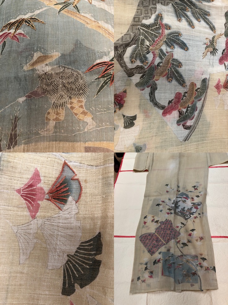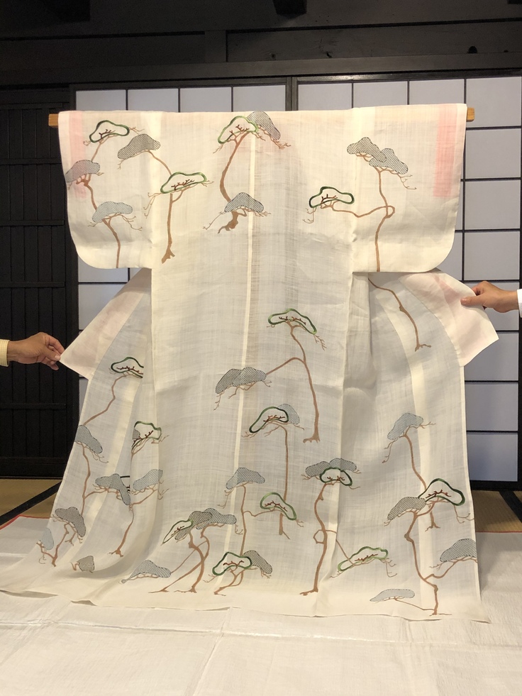 この「帷子」は太古から織り継いで来た「越後上布」などの「苧麻」を原料とした白生地(上の写真)を用いて、それを淡やかな薄紅色に染め上げたのちに秀逸な刺繍で瀟酒な図柄を丁寧に描きあげた夏の衣裳です。