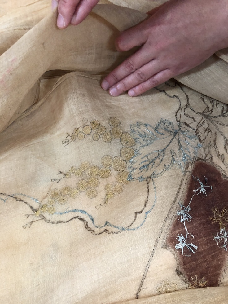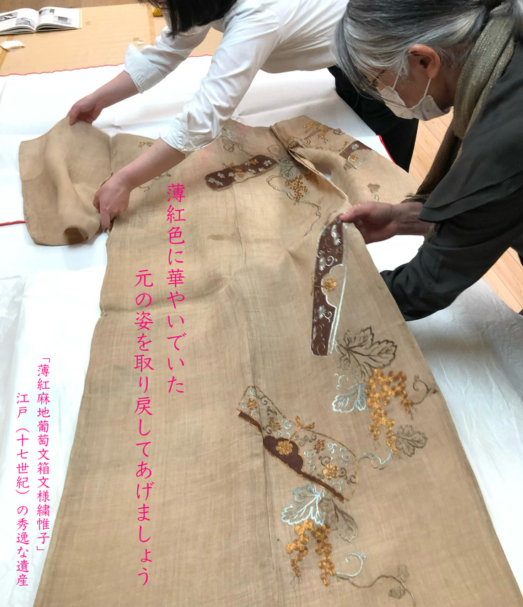 先ず今回復刻を目指す「薄紅麻地葡萄文箱文様繍帷子」についてお話しをさせて下さい。