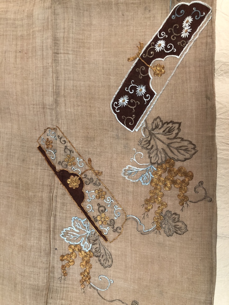 それにしても残念なことに以下の写真でご覧頂きますように薄紅色の地色は既に褪色して黄変し、総体に薄汚れてしまっていて、刺繍も浮き上がり、往時の華やいだ雰囲気を偲ぶには余りにも切ない有様なのです。