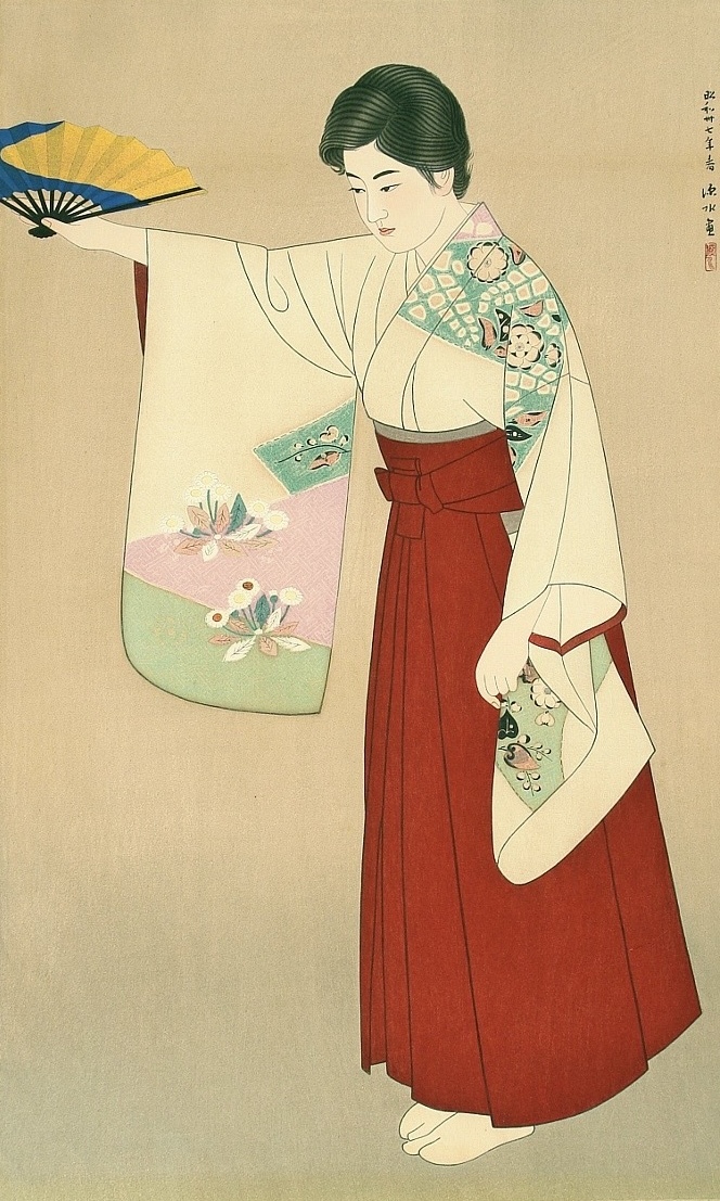 彼はこうして集めた古衣裳をその時代時代の浮世絵を参考にしながら実際に芸妓に着せて往時の風姿を扮装させて、それを写生する「故実研究会写生会」をも主催していました(大正12年〜)。