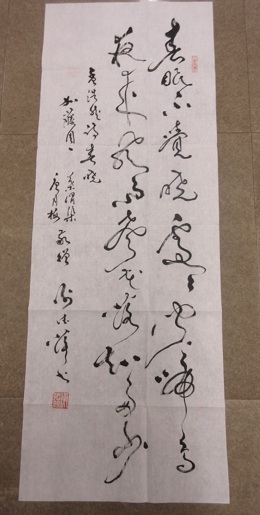 【加藤周一旧蔵の品、中国語版『日本文学史序説』を翻訳した唐月梅・葉渭梁による書「春暁」】