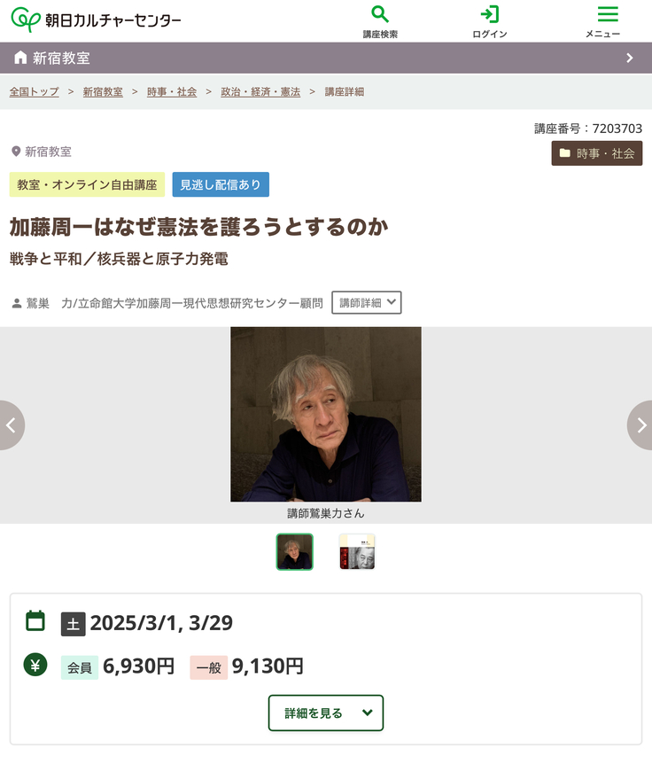 2025年3月1日(土)、29日(土)に鷲巣力顧問が朝日カルチャーセンターの講座に出講いたします。