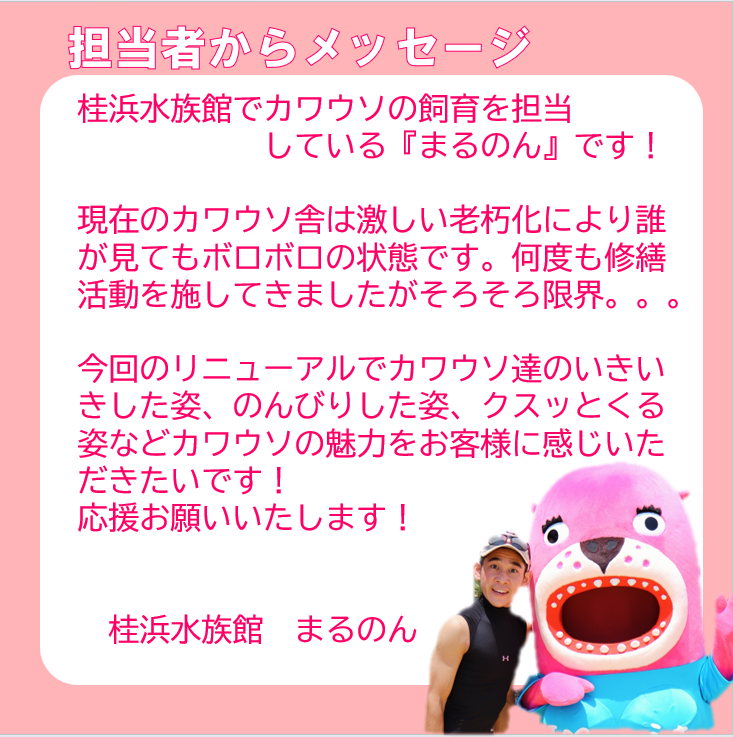 そんな桂浜水族館の「カワウソ舎」リニューアルということで、皆さんの応援が必要不可欠です!また元気なカワウソたちに会うべく、ぜひ皆さんのお力をお貸しください!