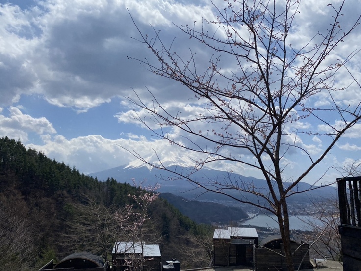 富士山と河口湖がみえる絶景のテラスの桜が、昨日からのあたたかさで、花を開きました!!