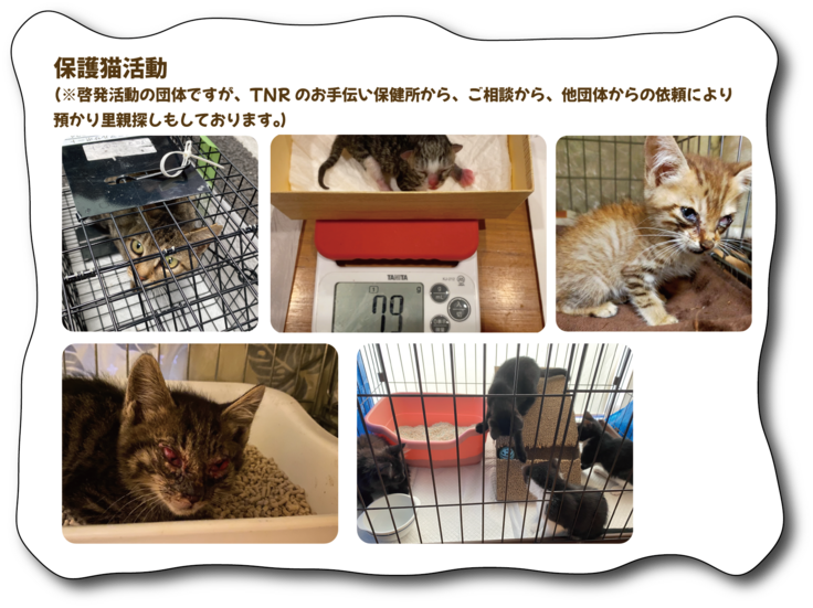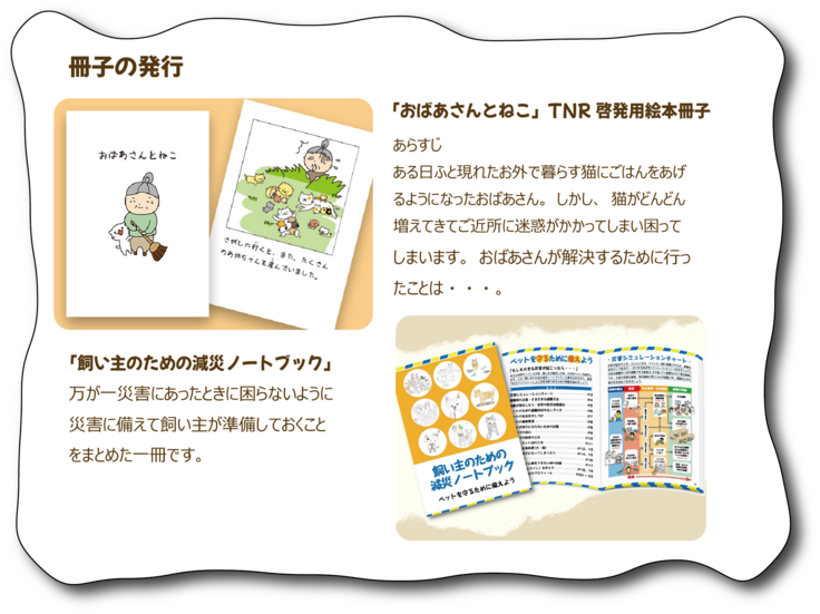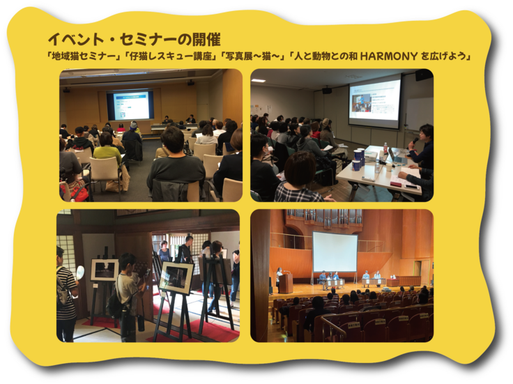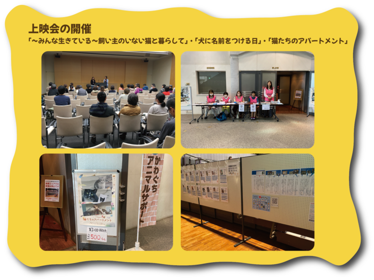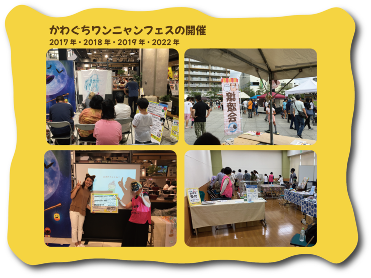 主な活動内容 【かわぐちワンニャンフェス】 2017年、2018年、2019年、2022年に開催 【上映会】 ・みんな生きている~飼い主のいない猫と暮らして ・犬の名前をつける日 ・猫たちのアパートメント 【イベント・セミナー】 ・地域猫セミナー ・仔猫レスキュー講座 ・写真展~猫~ ・人と動物との和HARMONYを広げよう 【譲渡会】 ・おとな猫とのあかい糸(成猫限定の譲渡会) 【冊子の発行】 ・おばあさんとねこ ・減災ノートブック