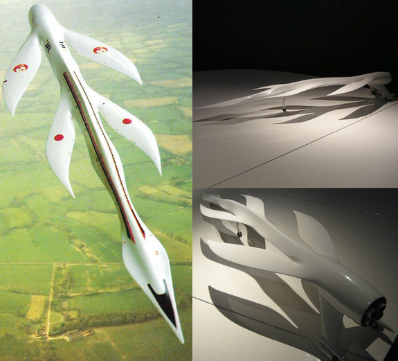 私はこれらの扇子のシェイプをベースにすることをコラーニ教授と相談し、さらに、かつてコラーニ教授がJALのためにデザインした美しい飛行機のラインの一部を親骨に取り入れることにしました。