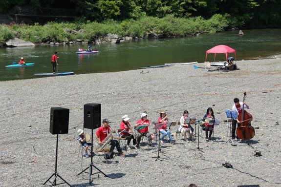 おかげさまで当日はすばらしい快晴に恵まれまして、さわやかな青空の下、のべ約500名のご来場者をいただきました。演奏もとてもすばらしいもので、これぞ川原で演奏するにふさわしい、という内容でした。出演者の方々は演奏後口をそろえて「気持ちよく演奏できた」とうれしい感想をおっしゃっていただきました。司会者からも「こんなに聴衆とステージが一体となって楽しんでいる演奏会はそうありません」と最大級のお褒めの言葉をいただきました。何より、ご来場された皆さんが、音楽と川原とその空間を本当に心からエンジョイしている様子があちこちで見受けられ「素敵だった。楽しかった。」という感想をたくさん頂戴しました。当日はNHKが取材に訪れ、当日と翌日、関東圏ではありますが、その様子が放送されました。また新聞も、茨城新聞(地元紙)、朝日新聞茨城版にも取り上げていただきました。