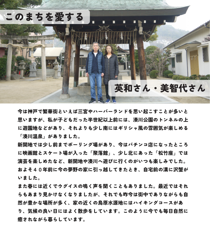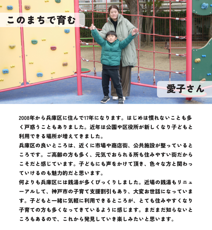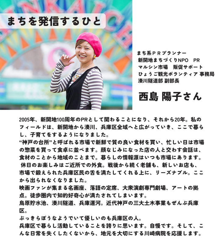 私は兵庫区で生まれ育ちました。菊水小学校・夢野中学校・市立神港高校に通いました。全て兵庫区の学校です。お母さんと一緒に買い物をした東山商店街・マルシン市場。「稲田串カツ」で串カツを食べて「鼻知場商店」でレモン水を飲むのが、お決まりのコースでした。神戸に帰省した時は、新開地駅で降りて湊川商店街のアーケードを歩きます。パークタウンや湊川公園、人工衛星饅頭を見ると、懐かしさと安堵の気持ちに包まれます。お母さんと私が大好きな「ウイングベーカリー」のドイツパン。優しい甘さの素朴なパンです。兵庫区には、私の大切な人や味、思い出がたくさんあります。