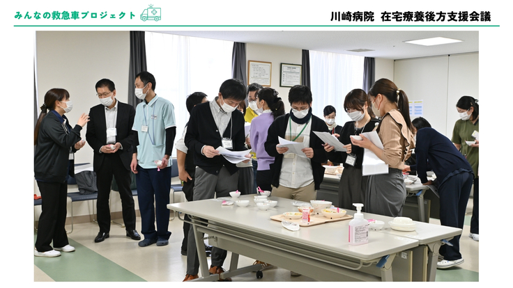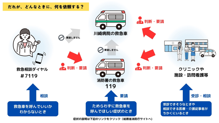当面の運用では、川崎病院の救急車を呼ぶと判断するのは、皆さんが普段受診しておられるクリニックの先生や、訪問看護師さんなどをはじめとする医療・介護の従事者と考えています。