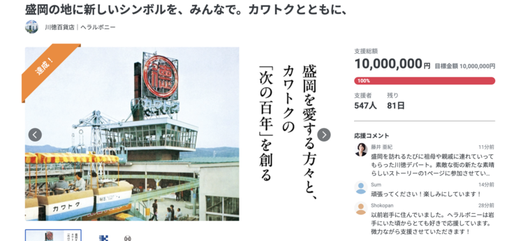 「盛岡の地に新しいシンボルを、みんなで。カワトクとともに、」に温かいご支援を誠にありがとうございます。