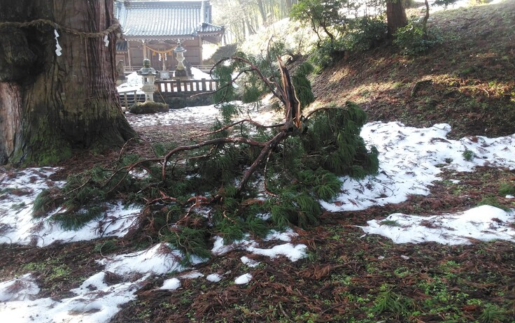 雪の重みで4本のご神木の一部の枝が折れてしまい、折れたままぶら下がっている枝がいくつもあります。それらの枝の除去と撤去、そして折れた箇所から菌が侵入することを防ぐための薬剤塗布などが必要な状況です。