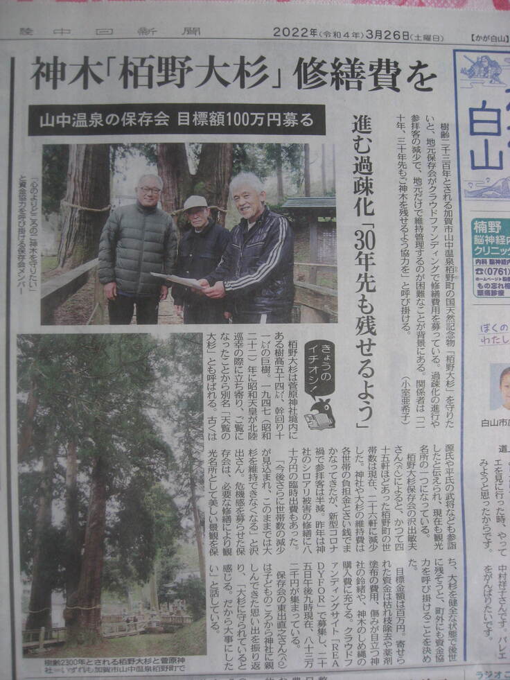 R4/3/26 北陸中日新聞「かが白山紙面」栢野大杉保存会の活動記事が掲載されました。皆様の心温まるご支援で第一ステップの目標額に近づいてきました。ありがとうございます。 栢野大杉保存会一同