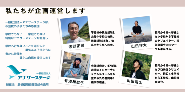 一般社団法人アナザーステージは、不登校の子供のたちの応援団。 学校でもない、家庭でもない、特別なアナザーステージを創造し、学校へ行かないことを選択した勇気ある子供たちに、豊かな時間と確かな自信を提供します。