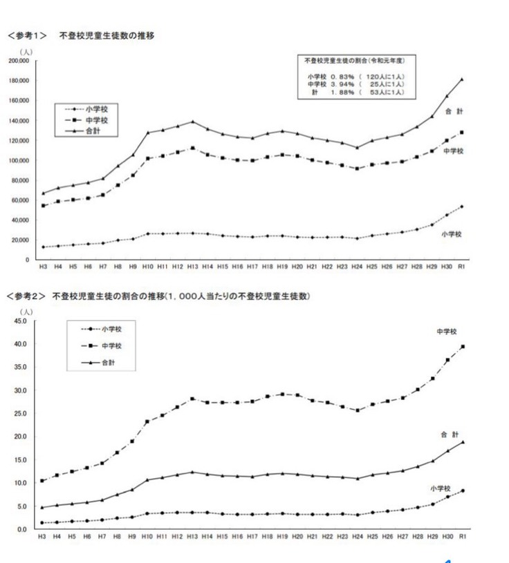以下のグラフは、不登校児童生徒数の推移です。ここ数年で急激に増えてきています。