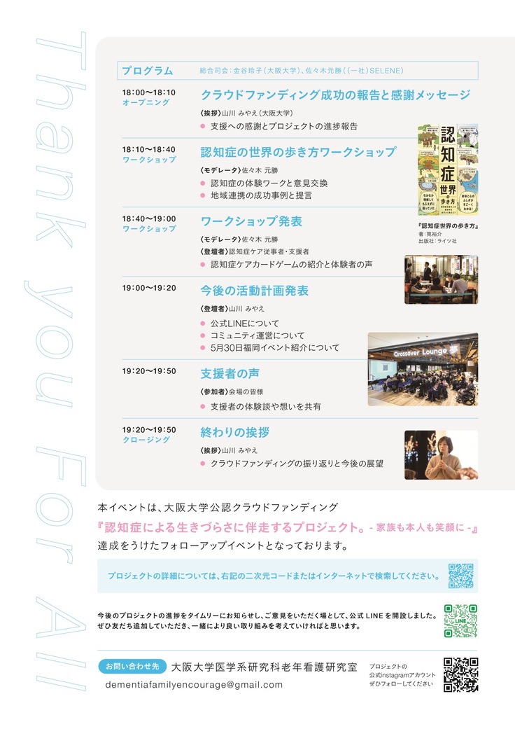 ちょっと迫ってますが、3月4日の18時から、クラファンありがとうイベントとして、ほんでこれからどうすんの?ってことをしっかりおはなししようと思います。また、家族家族って、本人は?というご意見もいただきますので、この機会に、認知症世界の歩き方のワークショップとともに、実際に本人目線と家族支援も両輪で考えてみようと言うことになりました。