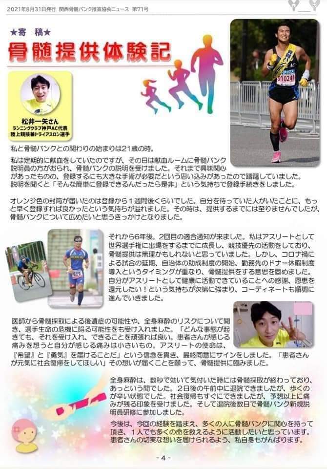 どうしても献血や骨髄バンクと聞くと、健康な方々から、貧血になる…とか、体力が無くなるから…とか、後遺症がある!って聞いたんだけど…とか、さまざまな理由や迷信により献血できる肉体があっても、一歩踏み出すまで至らないケースが数多く発生している現実があります。その点に関して、この松井一矢という身を尽くして、献血を繰り返し行い、骨髄バンクは実際にドナー提供者となった自分だからこそできることがある‼️と思い日々発信を続けています。さらに単純にマラソンをやるだけでなく、世界一過酷なトライアスロンと呼ばれているアイアンマン・トライアスロンよりも、さらに長い距離である" ウルトラマン・トライアスロン "に挑戦をすることで、自分の活躍すべてを、献血・骨髄バンク普及活動に繋げていきたい!という想いも持ってチャレンジを続けています。