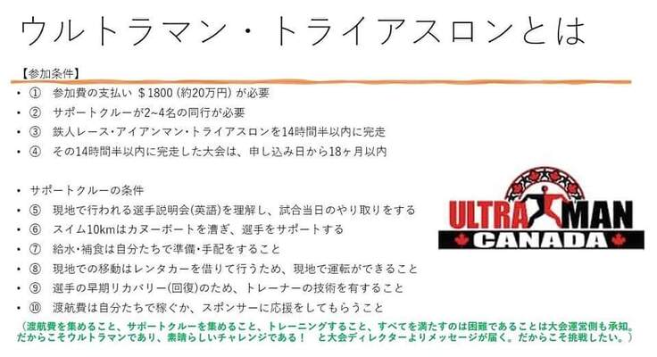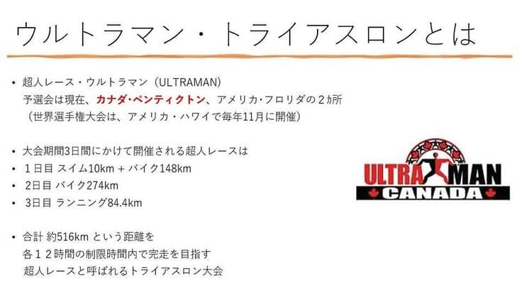 私が出場するのは、2023年7月28日~30日の3日間の日程で開催される「ウルトラマン・トライアスロンinカナダ・ペンティクトン大会」です。日本では開催されていない試合で、カナダ、フロリダ、アリゾナのいずれかに行くしか現時点ではチャレンジができない競技になっています。出場者は各50名以内。全世界から集まった50名がそこに集結します。コロナ禍による延期もあって本来は2020年7月大会に出場する予定でしたが、試合が延期となり、この度2023年大会に出場することが決まり、この度、クラウドファンディングを立ち上げました。