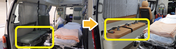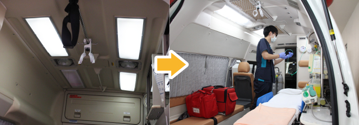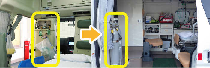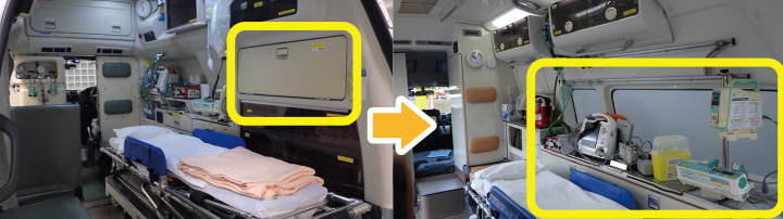 救急蘇生に必要な用具や薬剤を装備しておりますので、搬送中、患者さんの急変に的確に対応でき