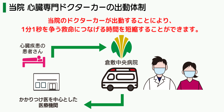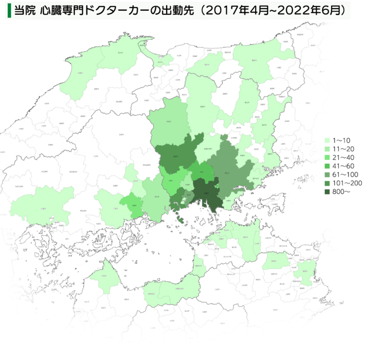 ドクターカーは地域の医療機関との連携の一環として運用を始めました。急変対応の装備も備えているためドクターカー内で救命処置ができます。当院へ搬送しながら治療を行うことで、到着後にカテーテル治療や外科手術などの専門的な治療にスムーズにつなげられた方も少なくありません。出動範囲は県内だけでなく、広島県、時には山陰や瀬戸大橋を渡って、四国の患者さんも搬送してきました。引き続き、地域の循環器疾患患者さんの診療にしっかりと取り組んでいく所存です。