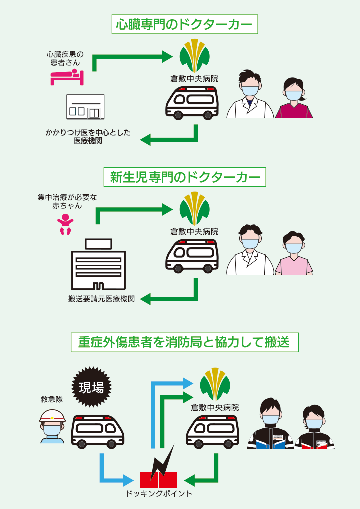 例えば、岡山県にある新見市消防局の「救急車」と当院の医師・看護師を乗せた「ドクターカー」が双方、合流地点(高速道路インターチェンジや消防署)へ急行。合流次第、当院医師、看護師が救急車に同乗し、当院救命救急センターへ搬送します。