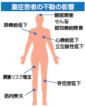 急性期病院では集中治療室に入室するような重症な患者さんでも、入院後間もない時期からリハビリテーションを開始しています。肺炎などの合併症や認知機能の低下、呼吸筋などを含めた筋力低下などの予防が期待され、救命後の集中治療後症候群(PICS)の改善などを目標に治療の一つとして早期に導入されています。
