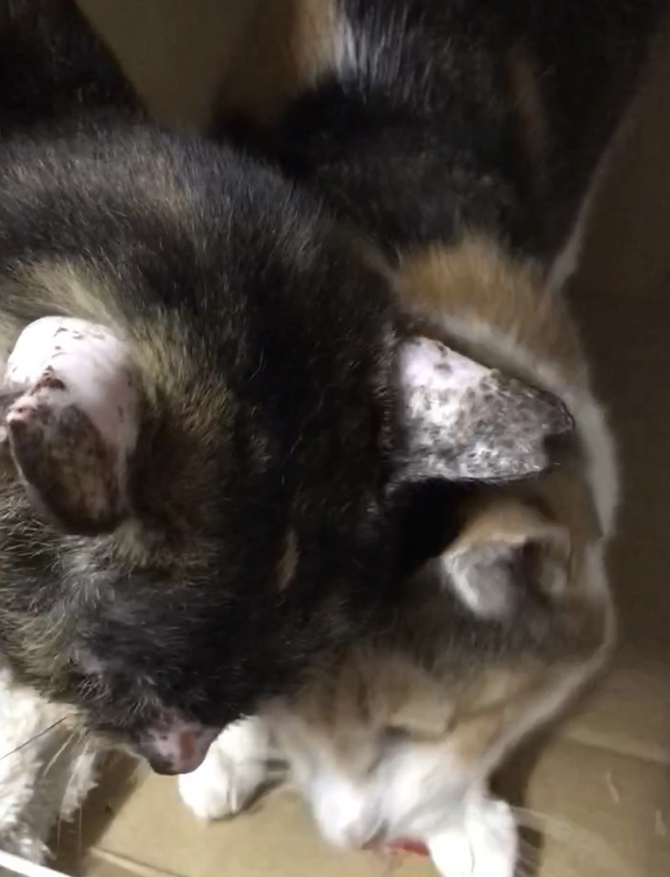 両耳の外側と鼻先、足先の皮膚に血が滲んだ状態で