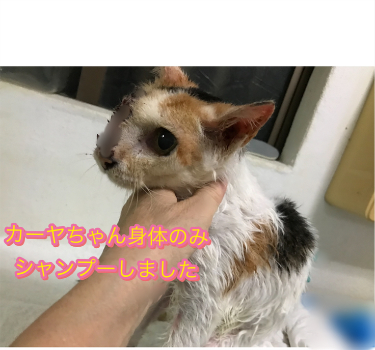 直視できないほどの状態ですが、カーヤちゃんは普通にご飯を食べます。頭や背中を拭いてやると、気持ちよさそうに身体を寄せてきます。