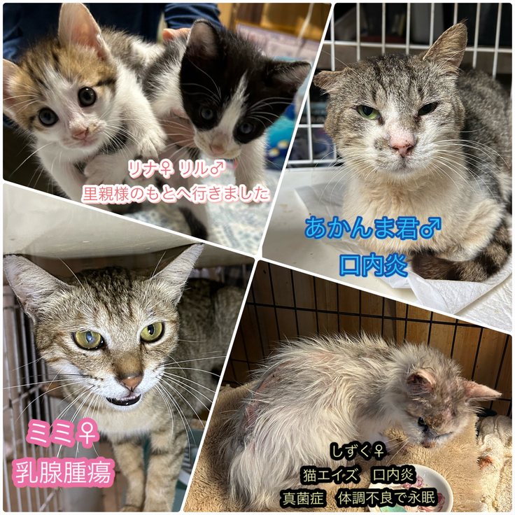 ●リルリナ 東京の優しいご家族に迎えてもらい、2匹一緒に幸せになりました。         ●しずく 全抜歯手術も乗り越え、液状フードも食べられるようになっていたのですが、体調不良で急に状態が悪くなり永眠しました。これから良くなっていくと信じていたのに、涙が止まりません。      ●あかんま君 痩せて毛もバサバサで舗道に横たわっていた猫。カリカリも食べるけれど、口内炎が酷く食べにくそうでした。現在は薬で口内炎も少しずつ回復、毛艶も良くなってきました。