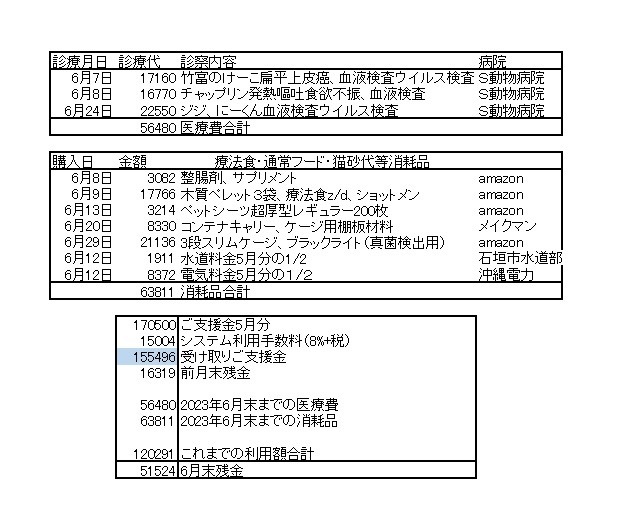 猫たちの医療費や保護に必要な費用は、毎月一定ではなく、多い時も少ない時もあるので、月末の残金がマイナスになることもありますが、翌月に繰り越しさせて頂き、長く続けられるよう頑張りますので、よろしくお願いいたします。