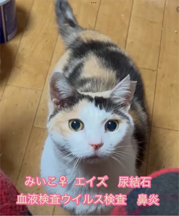 ⚫️みいこ くしゃみ、鼻水が出るようになり、受診。血液検査では特に異常なしでしたが、ウィルス検査ではエイズ陽性でした。喉の左奥には炎症部分が盛り上がり、口内炎になっています。
