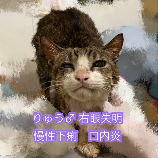⚫️りゅう もう何年も下痢に悩まされてるりゅうです。療法食や下痢止め、整腸剤などあれこれ試して、最近良くなってきましたが、なかなか安定せず、時々まだ便が緩くなります。抜歯してから歯肉炎は良くなっていますが、喉の奥には炎症部分が大きく盛り上がっています。右眼は子猫の頃に失明し、男の子なのに乳癌の手術も経験したりゅう…それでもいつもごきげんで人懐こい猫です。
