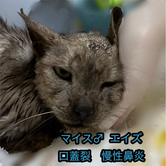 ⚫️マイス 口蓋裂で上顎に穴が開いているので、連続してくしゃみがでたり、食べ物が鼻から出てきます。おしっこも漏れてしまうため、体も汚れがちです。シャンプーはなんとか我慢してくれ、拭いてもらう時は嬉しそうです。抗生剤と鼻炎の薬を飲んでいる時は調子が良く、時々お薬休み期間を入れながら、お薬続けています。
