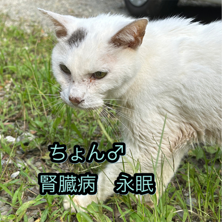 ●ちょん 猫エイズ陽性。永眠。腎臓病ステージ4で毎日リンゲル補液。長いこと、食欲不振が続き、体重は1.75kgまで減りました。脱水がひどく、リンゲル補液すると少し食欲が出ました。2枚目の写真は亡くなる3日前のものです。歩くのもやっとでしたが、外に出たがり、少しお散歩しました。保護したばかりの頃は、触られるのが怖かったようでしたが、最後は膝乗り猫でした。6月11日にとても静かに息を引き取りました。
