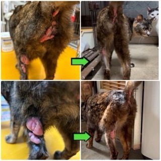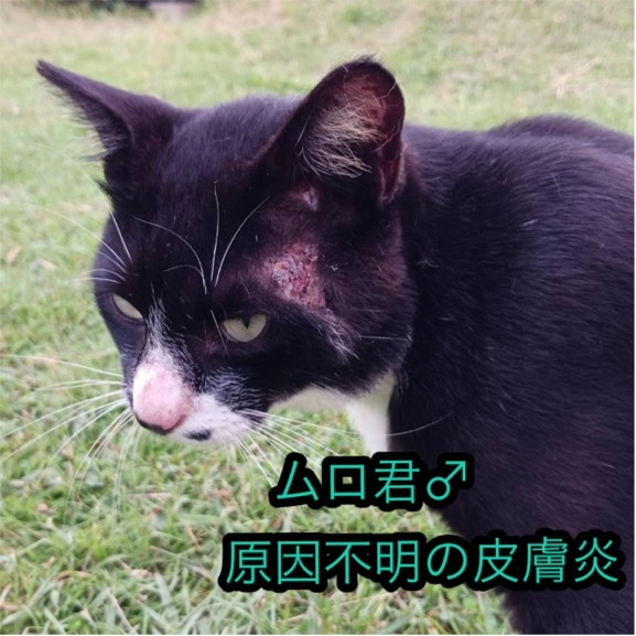 ●ムロさん♂ 捨てられてからストレスかアレルギーか、原因不明ですが、あちこちに皮膚炎を起こして保護。抗炎症剤がよく効いて皮膚炎は治ってきました。